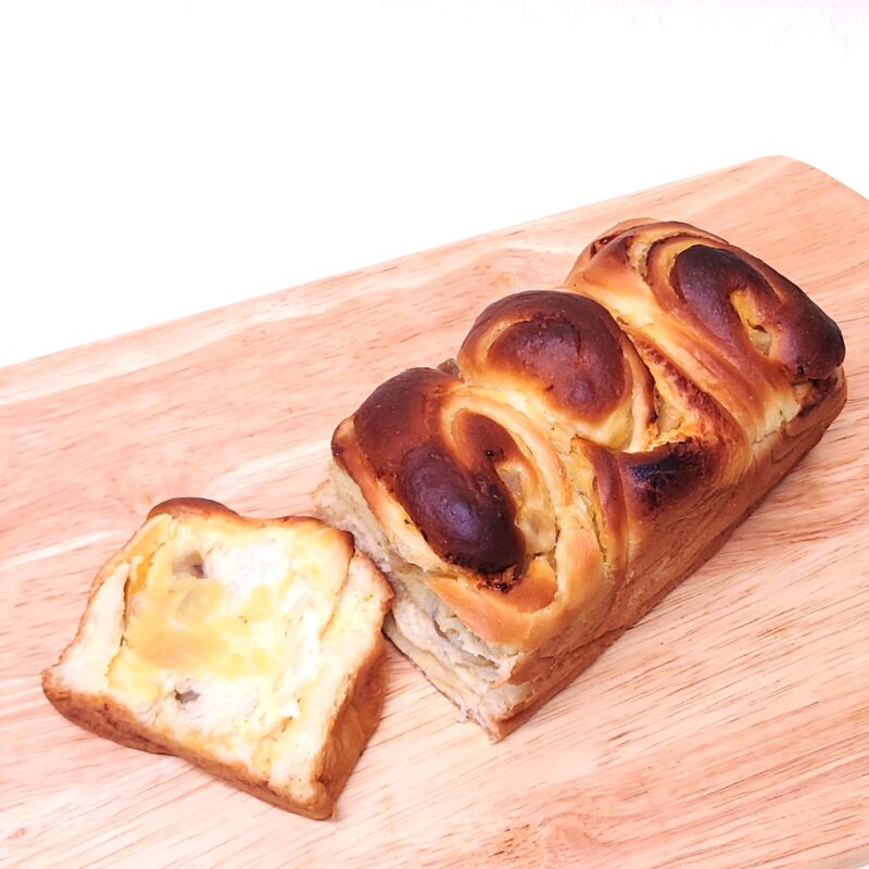 軟らかくて甘めの菓子パン生地に、ダイスカットしたサツマイモと口溶け滑らかで濃厚ないもあんをたっぷり練り込み、焼き上げています。イモ好きにはたまらない、秋らしい菓子パン。緑茶とも相性ぴったりです。