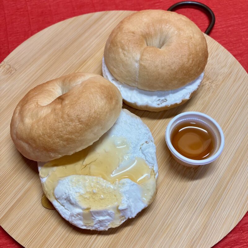 国産小麦、きび砂糖、沖縄産の塩を使用して軟らかめに仕上げたベーグルで、クリームチーズをサンド。チーズにプラスした水切りヨーグルトの酸味が爽やかな一品です。別添えのメープルシロップはお好みでどうぞ。