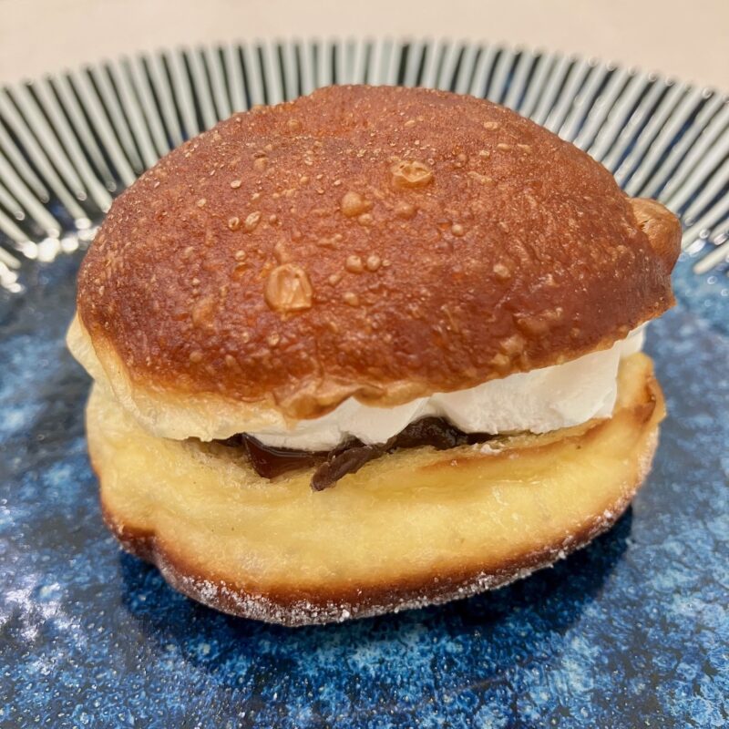 クリームチーズを練り込んだ生地を揚げたふわふわ、もちもちの“皮”で粒餡とホイップクリームを挟み、どら焼きに見立てた新感覚スイーツ。サクッと軽い食感で、時間がたってもおいしくいただけます。