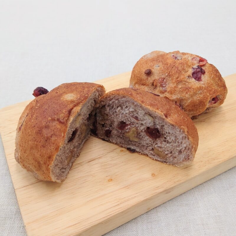 全粒粉に強力粉を混ぜた生地に、刻んだクルミと大粒のクランベリーをふんだんに練り込んでいます。しっとり軟らかく、クルミの歯応えとクランベリーの甘酸っぱさが印象的な一品です。