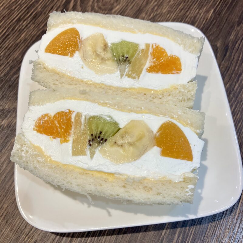 食パンに自家製カスタードクリームを塗り、練乳が隠し味の自家製ホイップクリームとキウイ、バナナ、オレンジ、黄桃、パイナップルをサンド。2種のクリームとフルーツの甘みが相まった、笑顔になる味わいです。