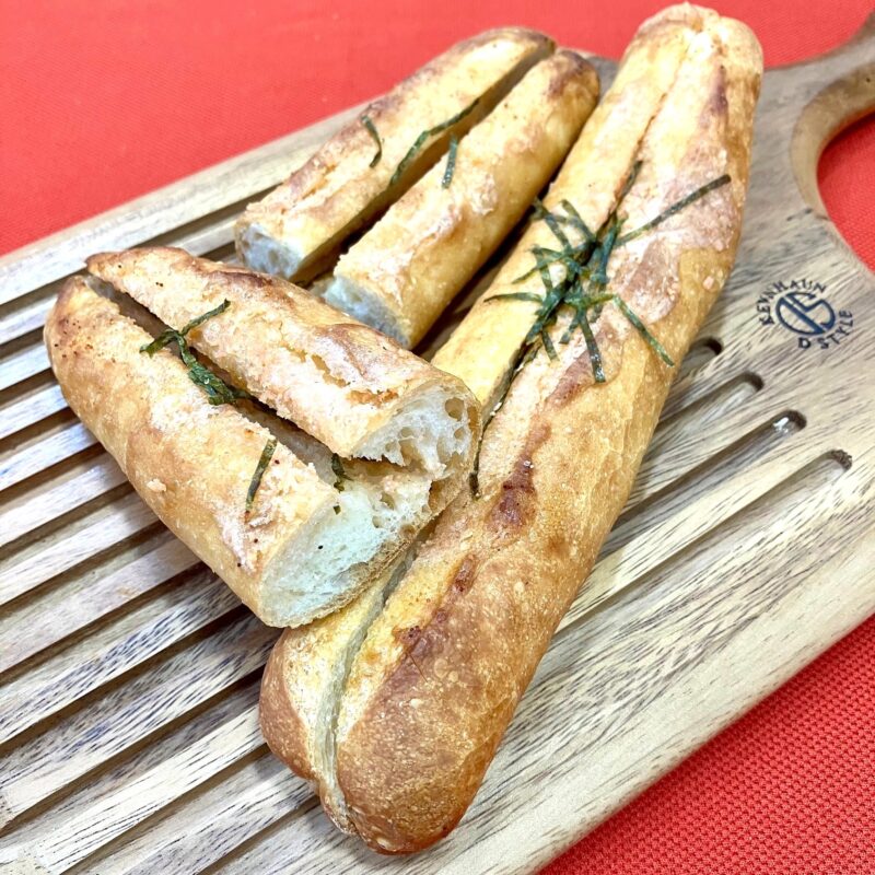 自家製フランスパンに切り目を入れ、福岡県産明太子に生クリームを合わせた自家製明太子ソースを挟んでいます。さらに表面にも塗って、刻みのりをトッピング。ワインやビールともよく合う人気商品です。