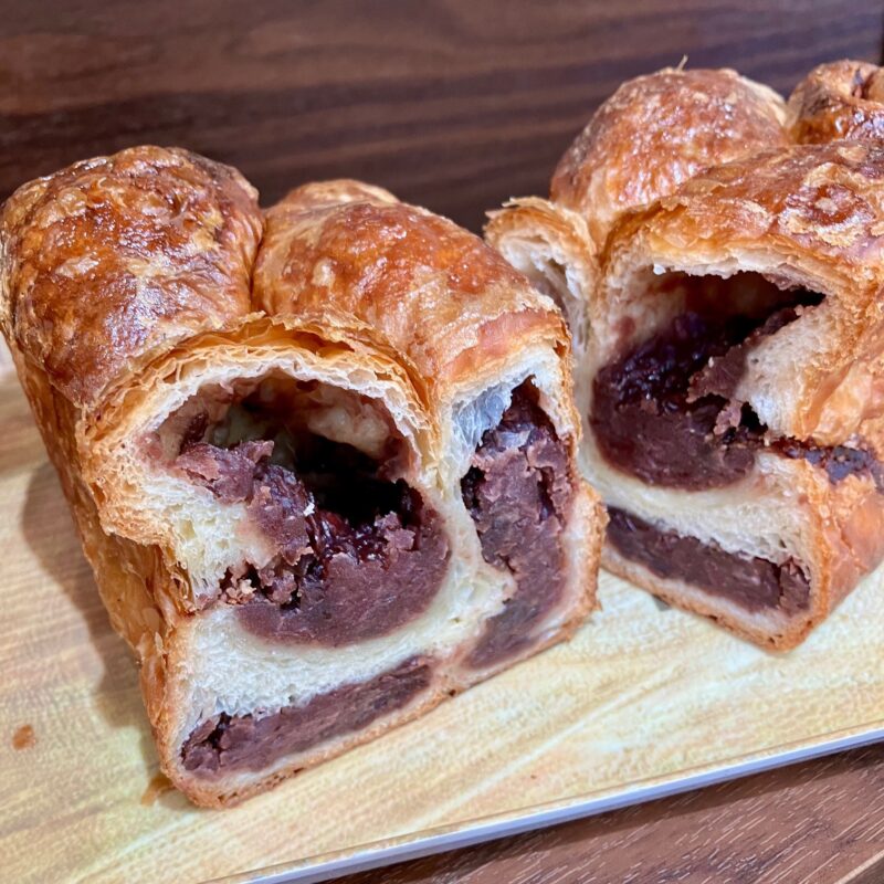 クロワッサン生地に粒餡を練り込み、食パンの型に入れて焼き上げています。生地の塩気があんこの甘さを引き立て、バターも豊かに香ります。リベイクすれば、外はパリパリ、中はしっとり。多幸感あふれるおやつパンです。