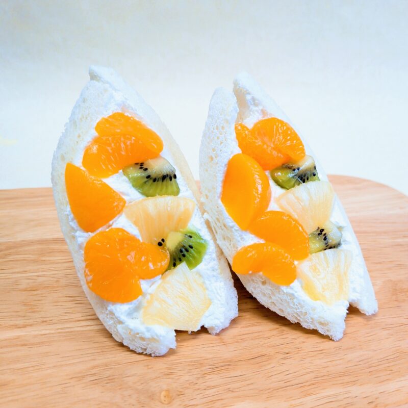 ふかふかのサンドイッチ用食パンでキウイやパイナップルなどのフルーツとホイップクリームをたっぷりサンド。果実の味わいを引き立てるため、クリームは甘さ控えめです。フルーツの種類は季節によって一部変わります。