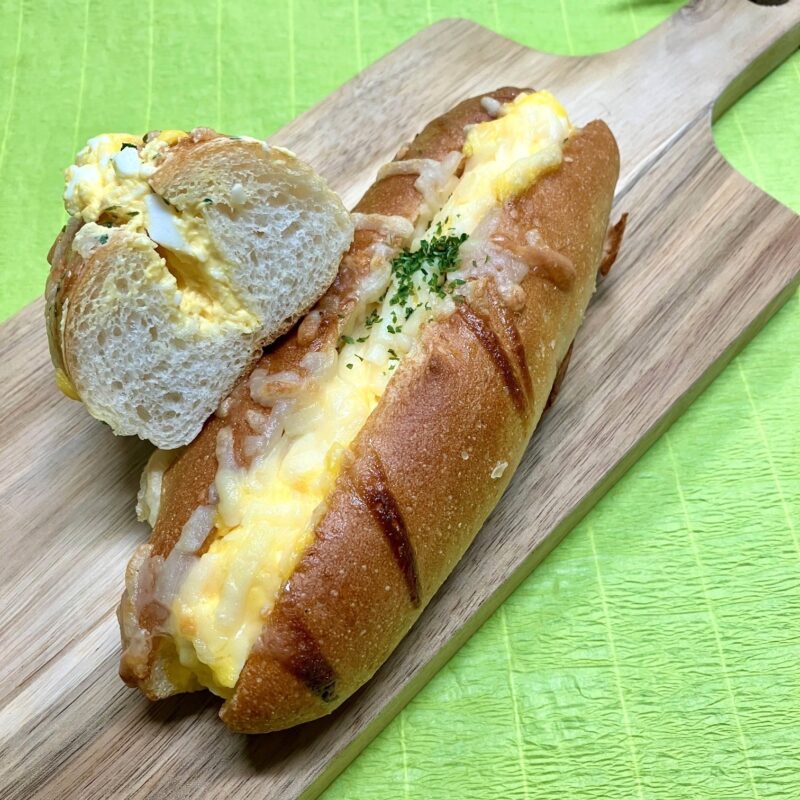 歯切れが良く小麦の香り豊かなフランスパンで、たっぷりの卵サラダを挟んでいます。トッピングのチーズがマヨネーズと相性抜群の一品は、長さ約20㎝のビッグサイズ。味、ボリューム共に満点の総菜パンです。