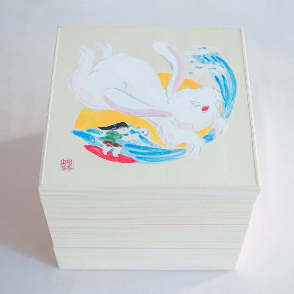 重箱のふたには画家、松本尚さんの手描きの縁起絵が入ります。今年の絵柄は受取日までのお楽しみ。1年目から集め、毎年楽しみにしているファンもいるそうです。