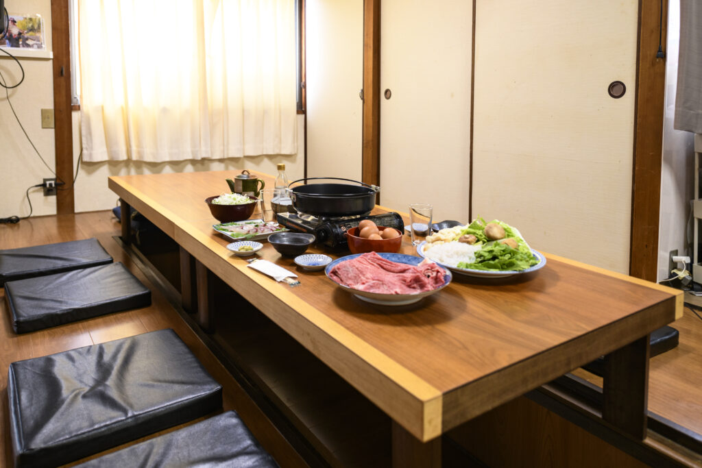 1階の2卓の一つ。肉や野菜がたっぷり用意された「すき焼き」(写真は2人前)。