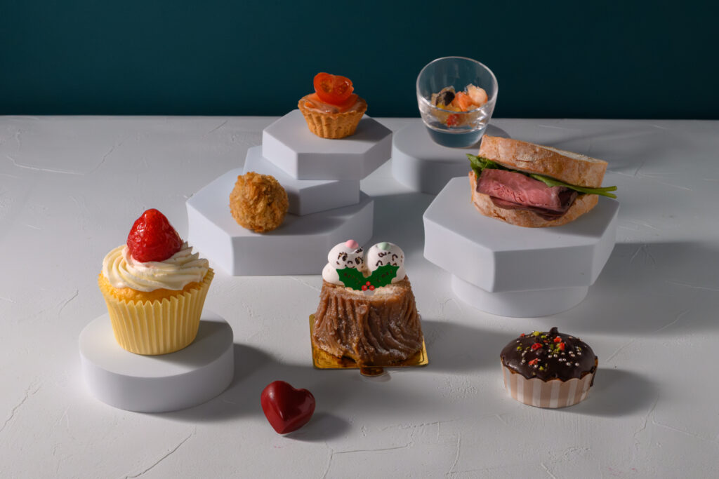 雪だるまのメレンゲ菓子を飾ったブッシュドノエルや聖夜の星空をイメージした焼き菓子など神戸の名店「コム・シノワ」のスイーツに、老舗「トアロードデリカテッセン」のローストビーフや「ハムと小エビのコンソメゼリー寄せ」といったセイボリーを合わせた計8種を味わえます。ドリンクメニューには、紅茶専門店「Lakshimi(ラクシュミー)」の紅茶も。ブルーグリーンのツリーが飾られたラウンジでクリスマス気分を満喫しませんか。