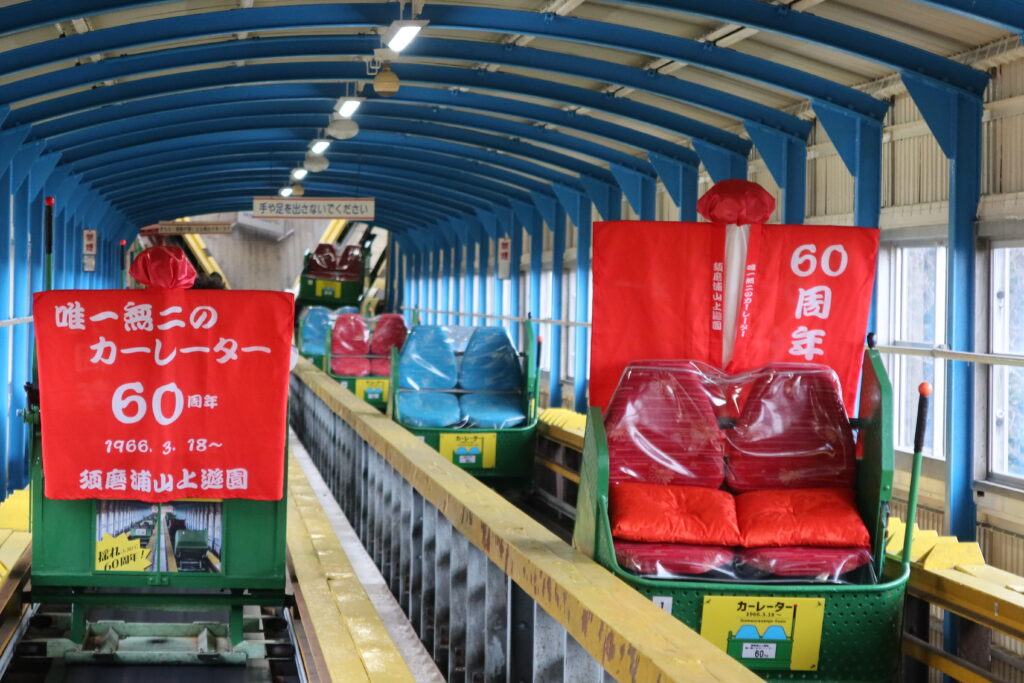 海沿いを走る山陽電車の「須磨浦公園」駅で降りてすぐ、鉢伏山と旗振山にまたがって広がるのが「須磨浦山上遊園」です。1957(昭和32)年に創業し、季節の花や景色と共に近年、昔ながらのレトロな乗り物が人気を集めています。ロープウエーに乗り、眼下に須磨海岸、遠くには関西国際空港を眺めながら鉢伏山の中腹へ。山上までは、今年3月に60周年を迎えた国内唯一の乗り物「カーレーター」で上ります。急斜面を進む2人乗りのゴンドラは荒々しくガタゴト揺れますが、乗り心地の悪さも醍醐味(だいごみ)の一つ。「還暦のお祝いとして赤いちゃんちゃんこを着せた特別号が、5月末まで走っていますよ」と同施設職員の田村将樹さんは話します。脇には登山道もあり、歩いて10分ほどで上ることができます。