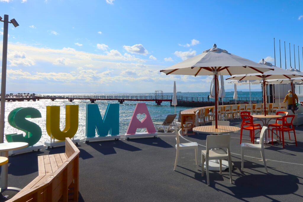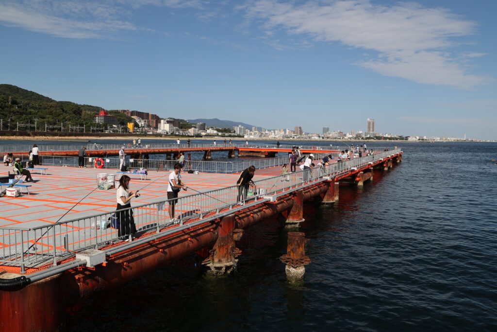 山の上で遊んだ後は、下山して「神戸市立須磨海づり公園」へ。2024(令和6)年に再整備され、海岸沿いにはリゾート感満載のテラス席と地元の海産物が味わえる食堂を備えた「波打ち際のSUMAてらす」が、沖に延びる通路の先には大きな釣り台があります。
