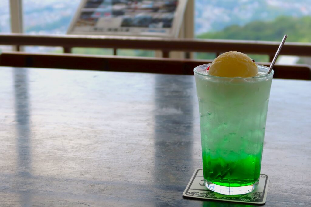 鉢伏山に戻って回転展望閣3階にある「喫茶コスモス」で一休み。床がゆっくりと回り、約1時間で360度の景色が楽しめます。メニューには昭和の香り漂う「クリームソーダ」(700円)もあり、レトロな気分を高めてくれます。