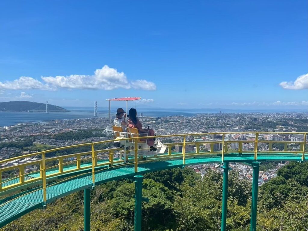 旗振山へと谷に沿って進む「観光リフト」は、1人乗りの座席に手すりと屋根が付いた至ってシンプルな造り。最初は「落ちないように」と緊張が走りますが、揺れも少なく、開放感たっぷりの空中散歩を満喫できます。瀬戸内海と明石海峡大橋の雄大な景色は、他では見られないアングルです。ちょうど旧の摂津国と播磨国の境に位置し、途中で“国越え”も体験できます。