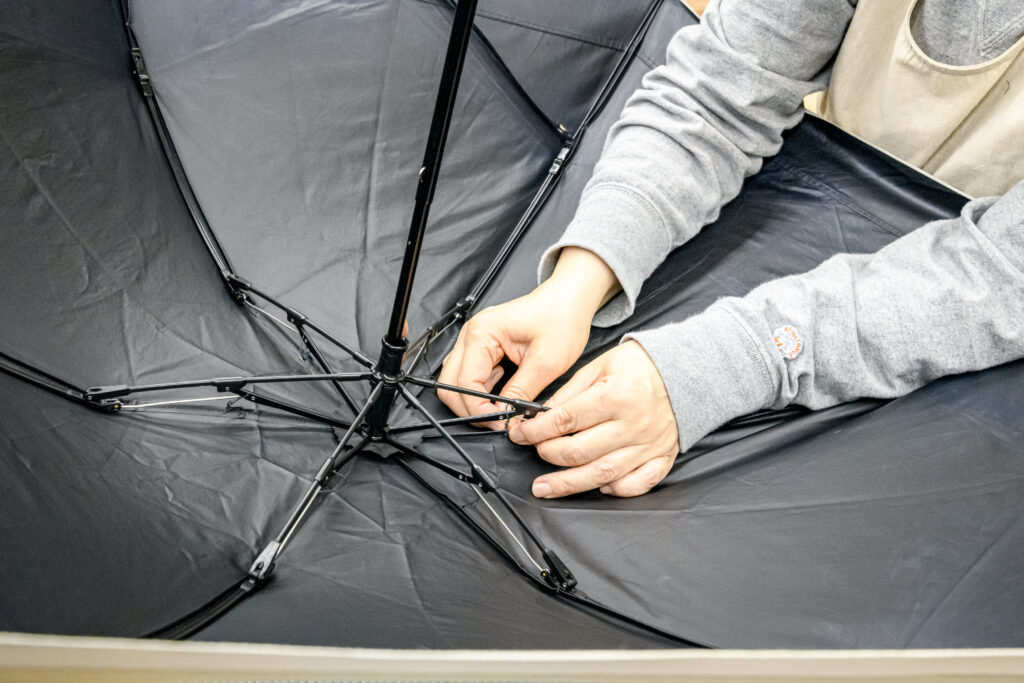 「サンバリア100」の日傘は遮光性能が経年劣化しないのが一番の特長です。その理由は、独自構造の生地にあります。表のポリエステルの裏に、ポリウレタンの黒色フィルムラミネート2層を接着層で貼り合わせた4層構造を採用。「裏側を黒くコーティングするのではなく、フィルムを2枚貼り合わせることで、塗りむらやピンホール(穴)をなくし、光をシャットアウトします。生地が破れない限り、遮光率は100%のままです」と、パイオニアとしての自信をのぞかせます。光も風も通さない高密度の生地は、風を受けた際に骨組みへ大きな負荷がかかるため、骨自体も自社で開発したものを使用しています。