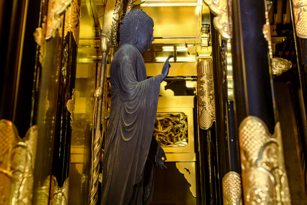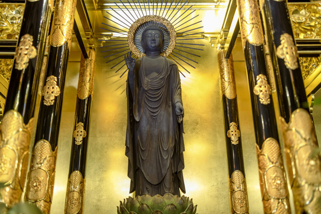 本堂の正面奥、金色に彩られた内陣に木造阿弥陀如来立像は立っています。穏やかで絵画的な「安阿弥様」の特徴をよく示し、衣紋も繊細な線で刻まれています。「丸い古風なお顔がとても穏やかで慈しみを感じます。衣紋の彫刻も本物の衣のように柔らかい雰囲気で、どうやって彫ったのだろうと感心させられます」と中尾さん。その一方で玉眼が用いられた目は鋭く、りりしさも感じさせます。