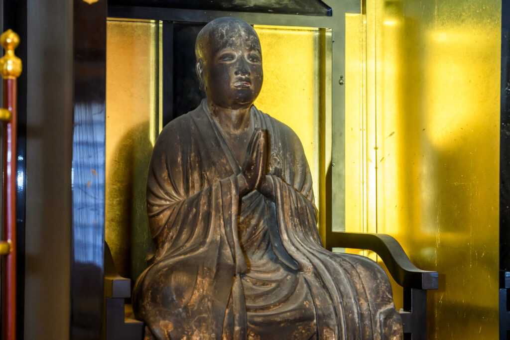 もう一体、見逃せないのが、同じ本堂内にある木造善導大師坐像。こちらも国指定重要文化財です。「善導大師は中国唐代の高僧で、中国で浄土教を大成した方。口を少しだけ開けて名号を称(とな)える姿は写実に徹している一方で、お顔は童子のような愛嬌のある表情を浮かべています」。2つの性質が作品の中に混然一体となっているのは、14世紀ごろの彫刻の特徴だそうです。