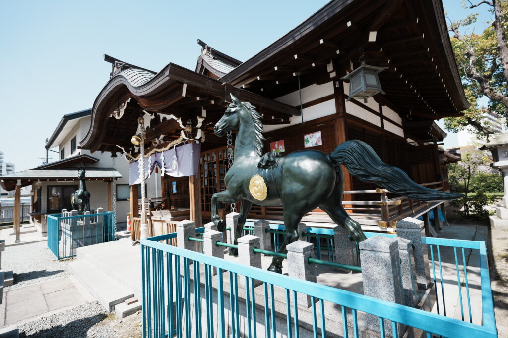JR「西宮」駅の北、住宅街の一角に立つ神明八幡神社では、ご祭神にちなんだ馬の像に出合えます。ご朱印にも馬が登場する、午(うま)年にぜひ足を運びたいお宮です。