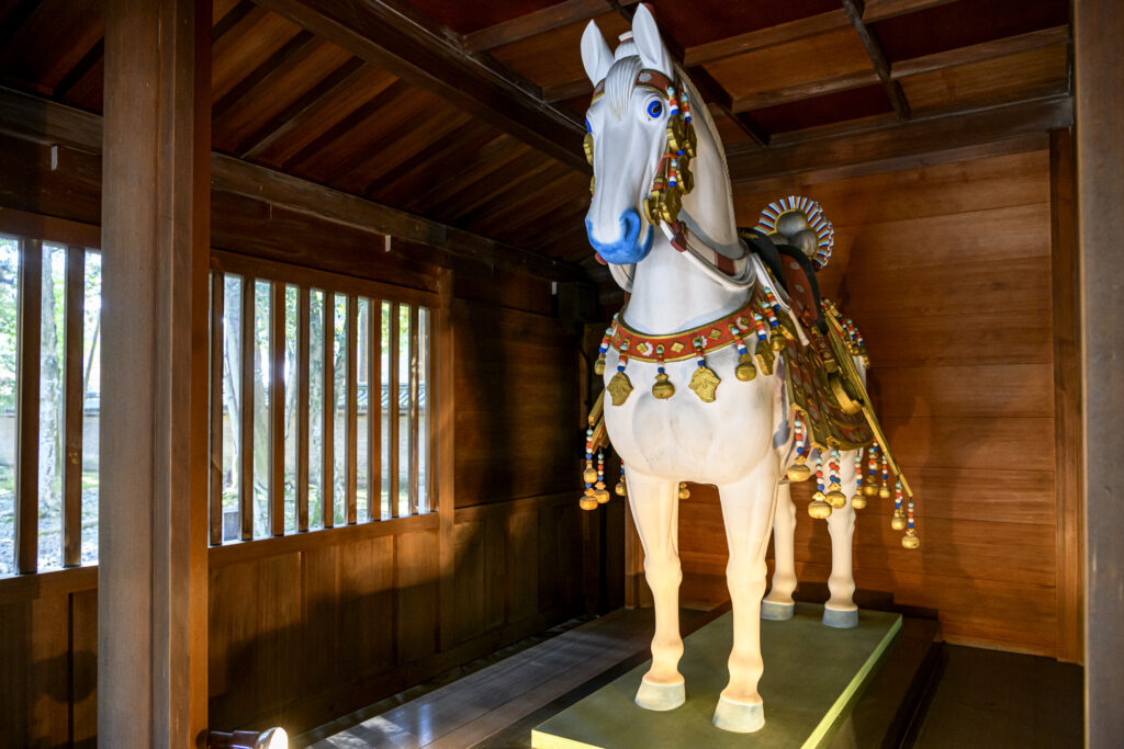 ご神馬像が納められている神馬舎は拝殿の脇にあります。華やかに化粧を施され、色鮮やかな馬装具で飾られた白馬は美しく、神様の乗り物にふさわしい輝き。2人の彫刻家が共同で1年半の歳月をかけて制作したそうです。