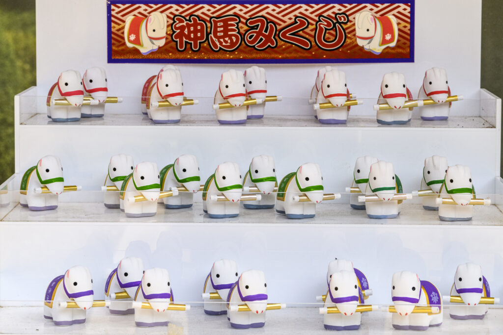 訪れた際は、「神馬みくじ」をお忘れなく。ご神馬像のミニチュアがおみくじをくわえており、その愛らしさは思わず笑顔になるほど。ころんとした姿形がほっこりとさせてくれます。一年の運を占うとともに、午(うま)年の常勝を願って家に飾っておくのもいいかもしれません。