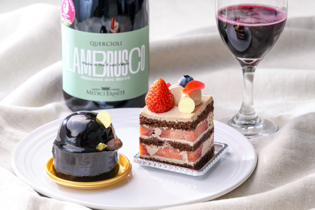 持ち込み品のおすすめは、3月18日にオープンした「カファレル 大丸神戸店」の「ジャンドゥーヤ」(777円)と「いちごのチョコショートケーキ」(799円)。生ケーキが買えるのは北野本店と同店のみです。チョコレートケーキによく合うイタリア産のスパークリング赤ワイン「クエルチオーリ レッジアーノ ランブルスコ セッコ」(1,650円)は和洋酒売り場で購入できます。