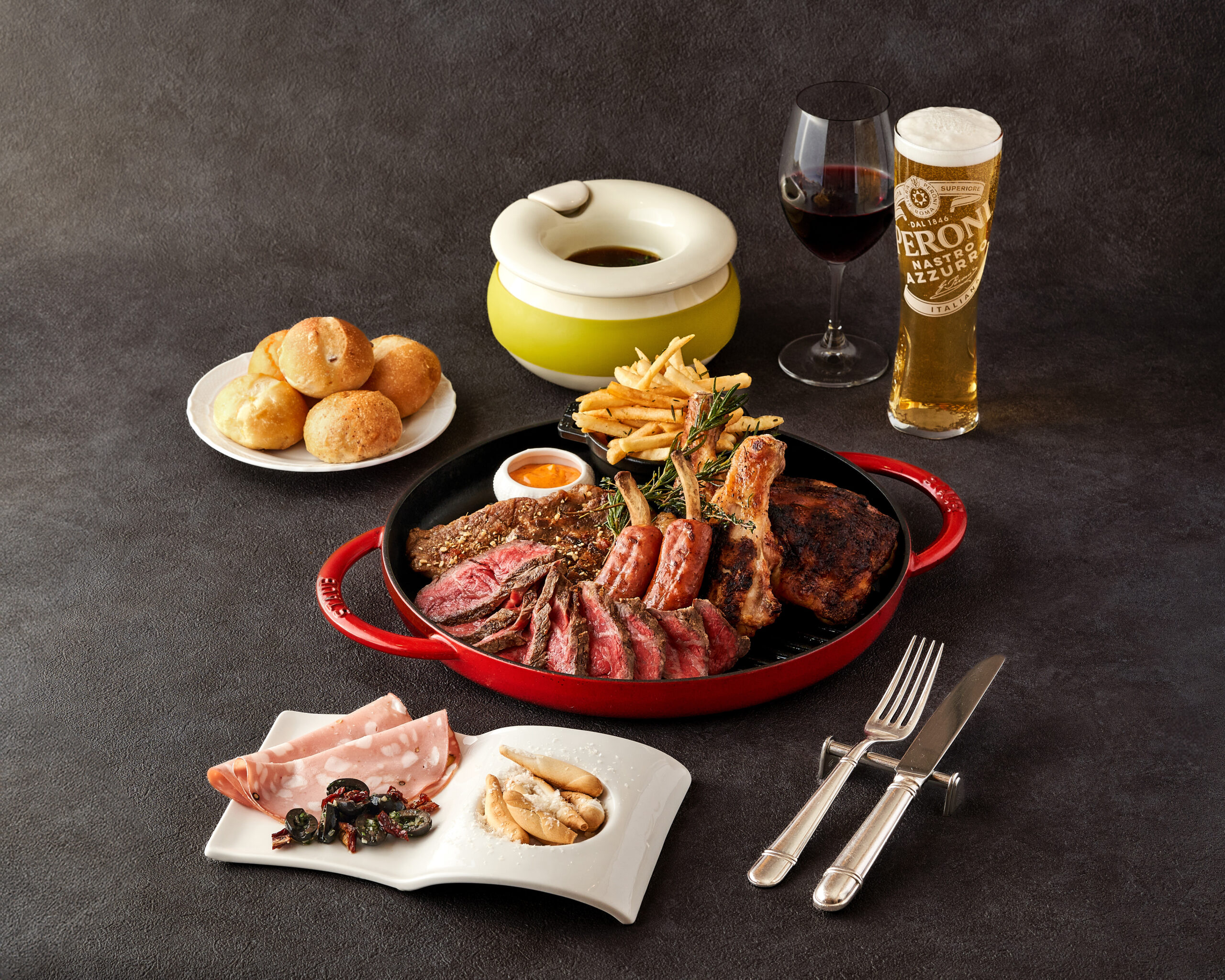 2025(令和7)年3月、神戸のウオーターフロント、新港第一突堤にオープンした白亜の「ラスイートルパンビル」は、ホテルやベーカリーなどを運営するラスイートグループによる複合施設で、メリケンパークや神戸ハーバーランドを望む絶好のロケーションに立っています。中でも屋上エリアにある「ルーフトップ レストランバー エス神戸」は開放感抜群。春から秋にかけてビアガーデンが開催され、5月31日(日)までは「Meat Festival~肉の饗宴~」と題し、「国産牛サーロインの網焼き」や「兵庫但馬どり骨付きもも肉のスパイスオーブン焼き」「神戸ポークのデュカロースト」といった“ミートオールスターズ”が味わえる「“肉の饗宴”プレートプラン」を提供しています。